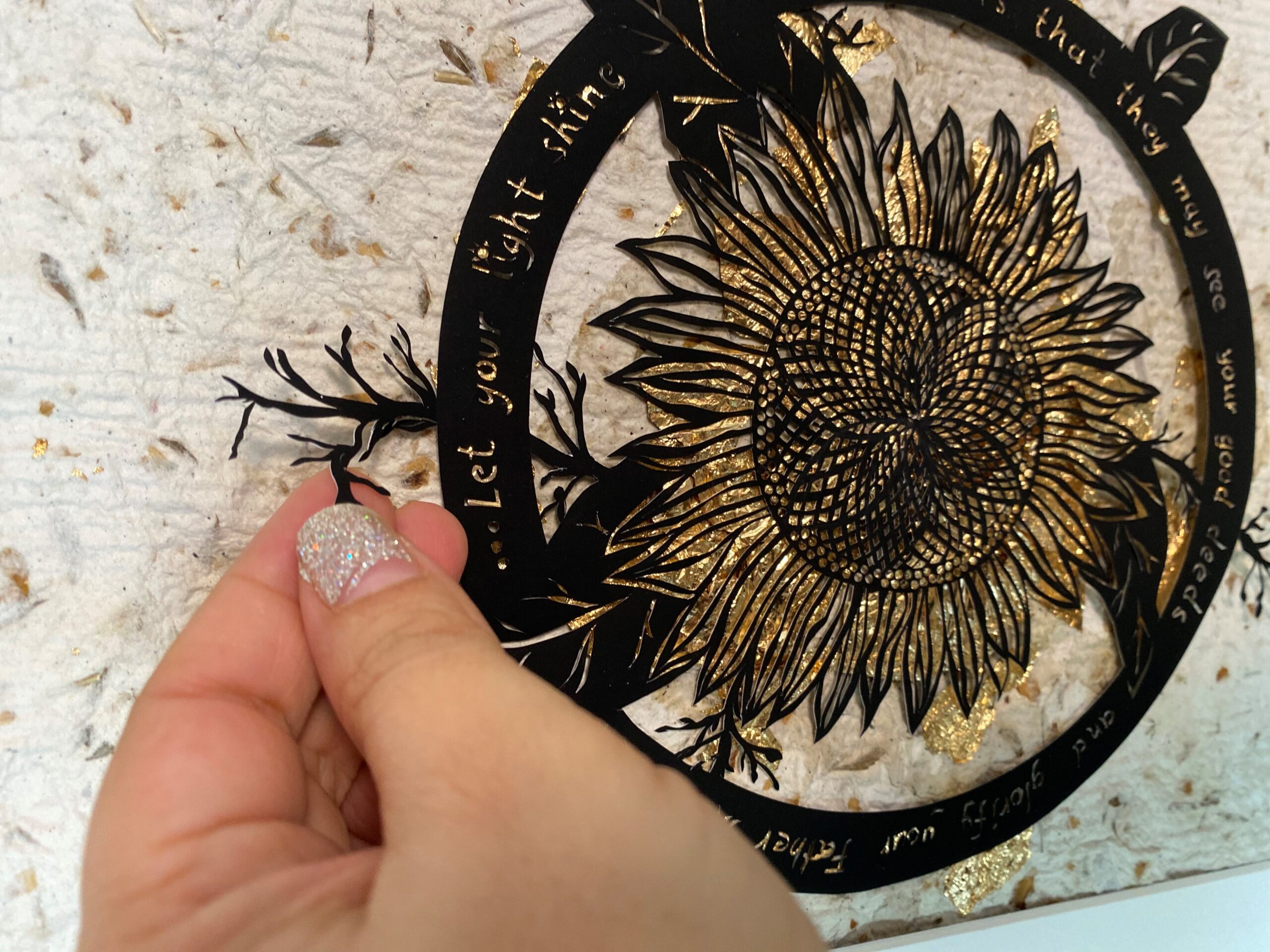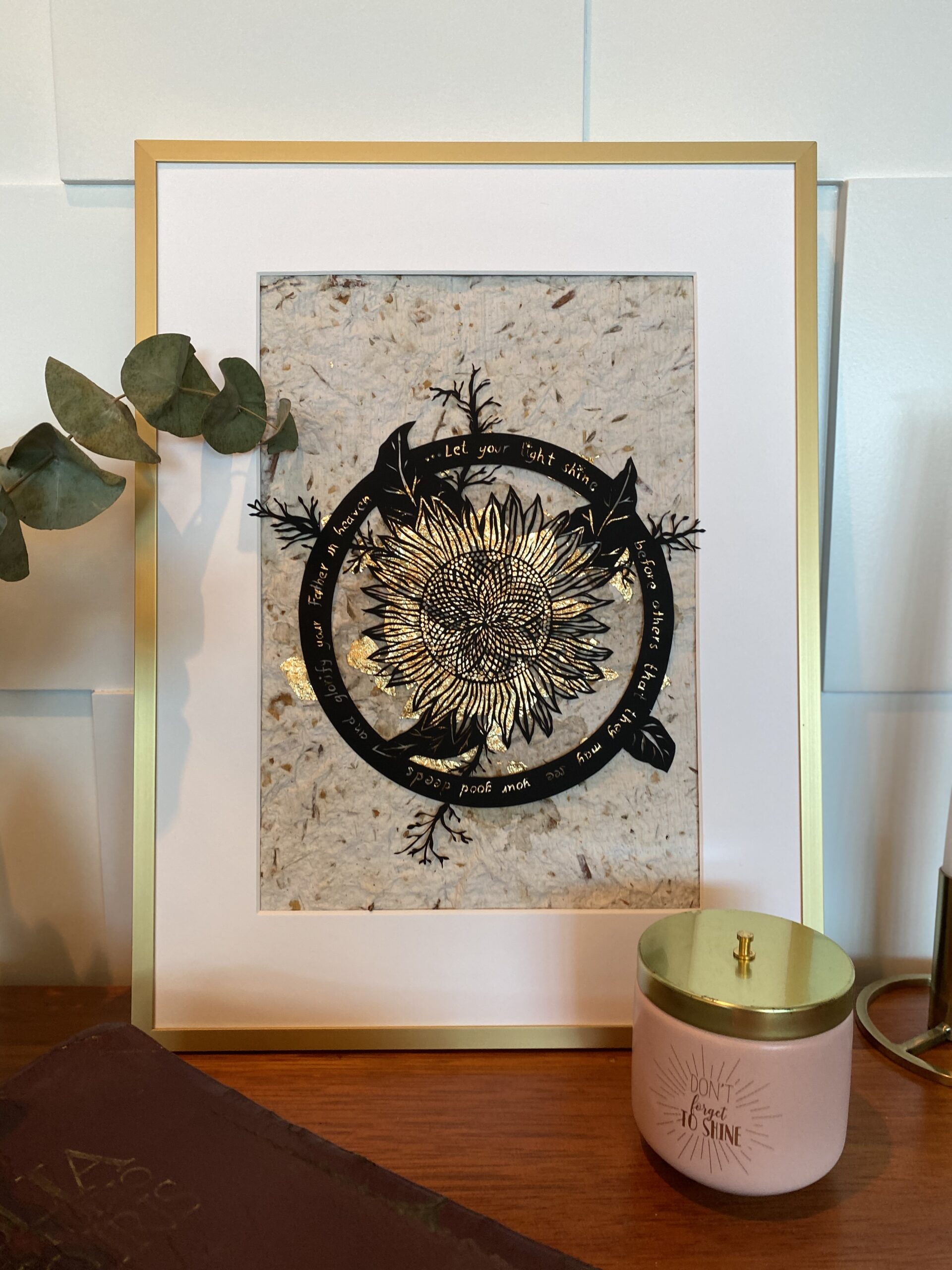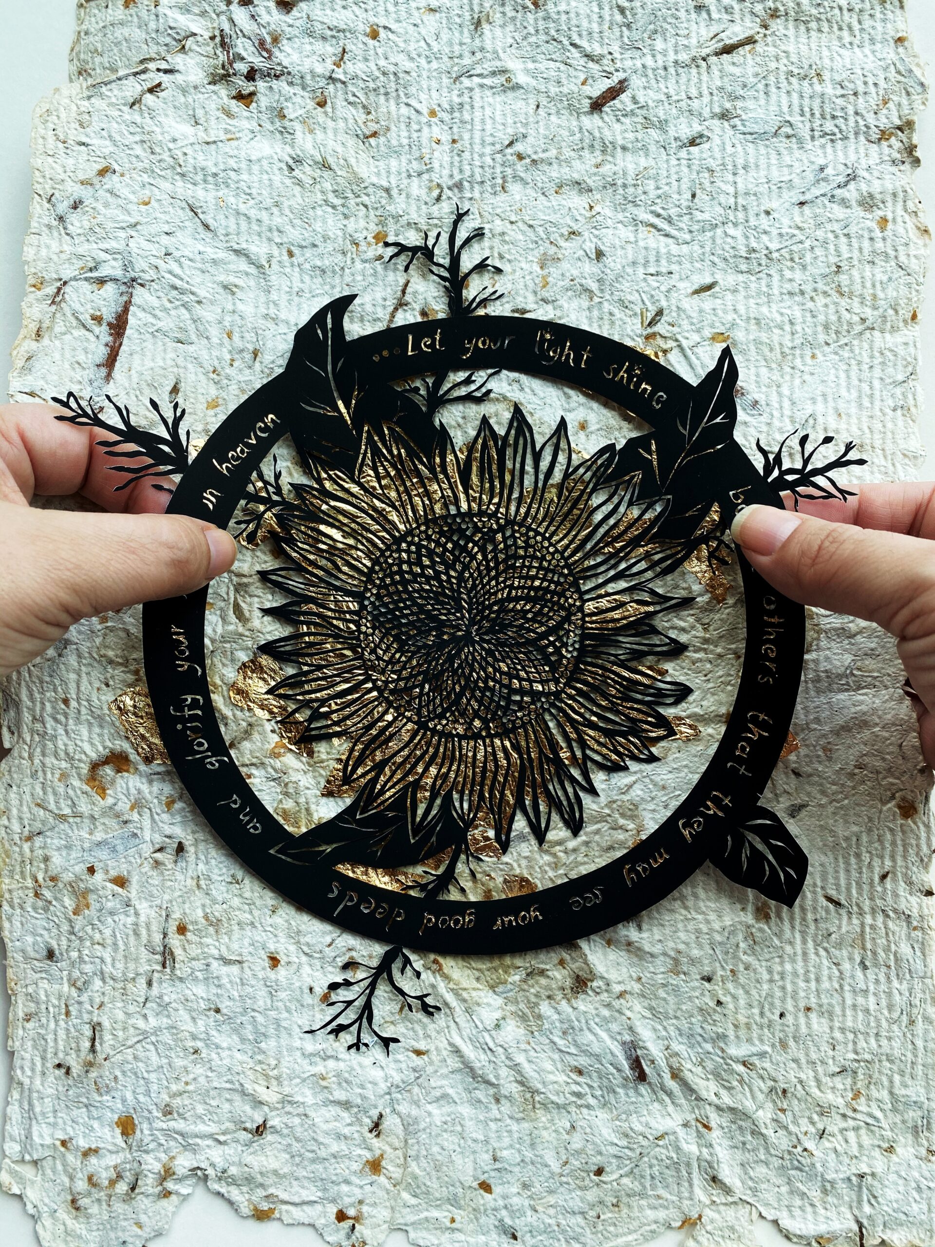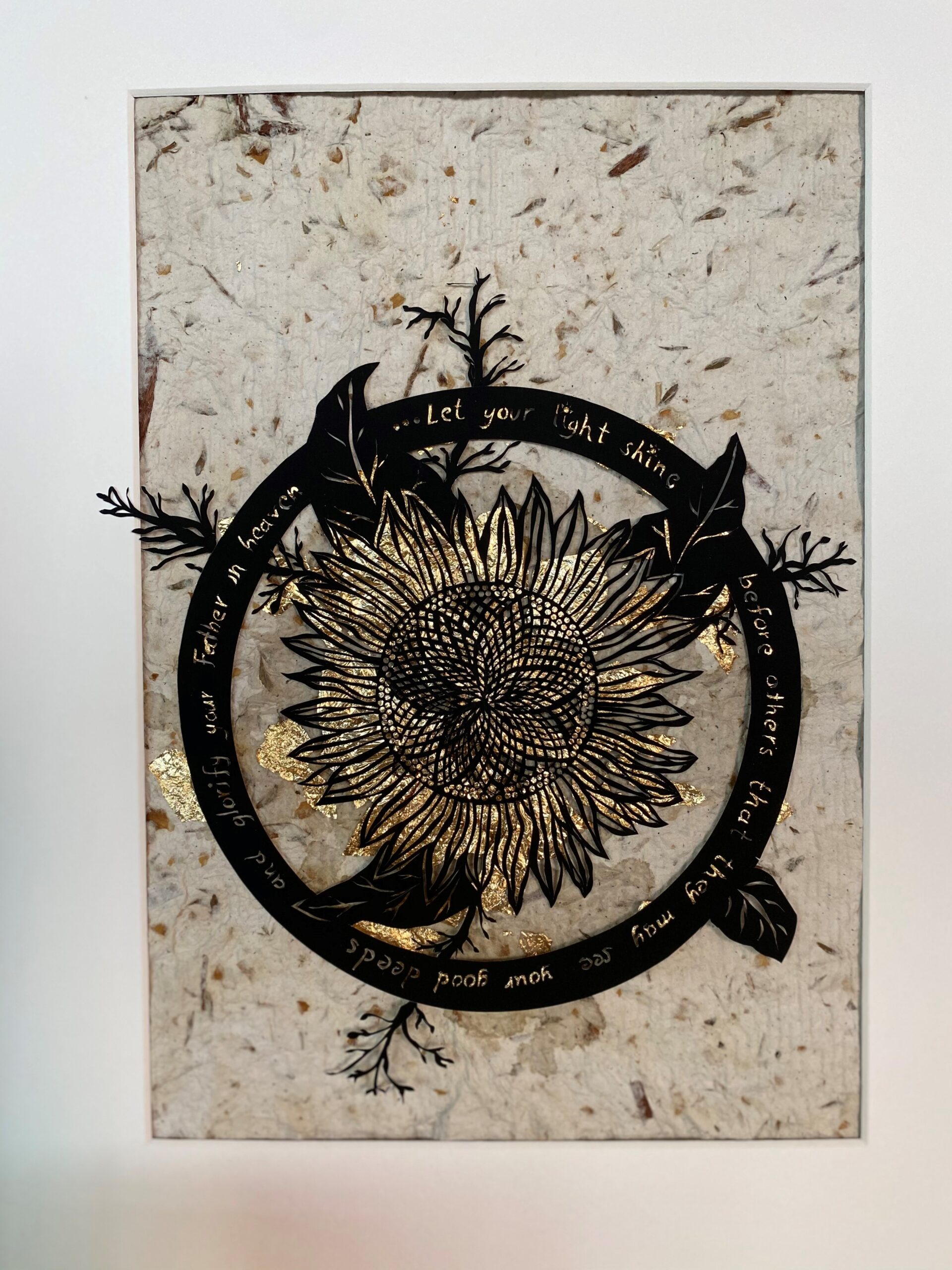 Sunflower – Paper cut 19cm of diameter with on hand made paper with gold leave. As sunflowers follow the sun to grow and to show their beauty we are called to shine our light to reflect the Father.